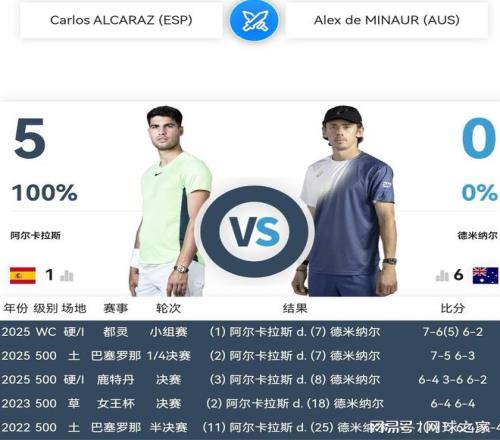 这一次阿尔卡拉斯冲击澳网四强的对手乃是世界第六、本土作战的澳大利亚小野兔德-米纳尔。职业生涯至今,阿尔卡拉斯五战德-米纳尔全部奏凯,这次似乎迎来了冲击澳网四强的绝佳机遇。然而,本土作战的徳-米纳尔岂甘久负于他,必定奋起抵抗,力争职业生涯第一次闯进大满贯四强。